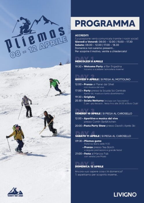 From April 8–12, get ready to experience the “free-heel” spirit with Pliemas, a five-day event turning our ski area into a unique gathering for the international telemark community. Sport, fun, and the unmistakable style of Livigno Skipassion come together in an unmissable program.