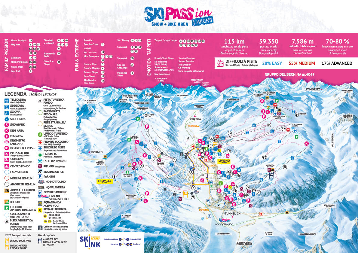 Il comprensorio sciistico di Livigno ti consente di provare ogni giorno nuove piste e tracciati per il tuo divertimento sugli sci, su uno o sull’altro versante della vallata. Scarica o consulta online le mappe invernali di Livigno con tutti gli impianti di risalita e le piste di discesa e organizza al meglio la tua attività sulla neve.