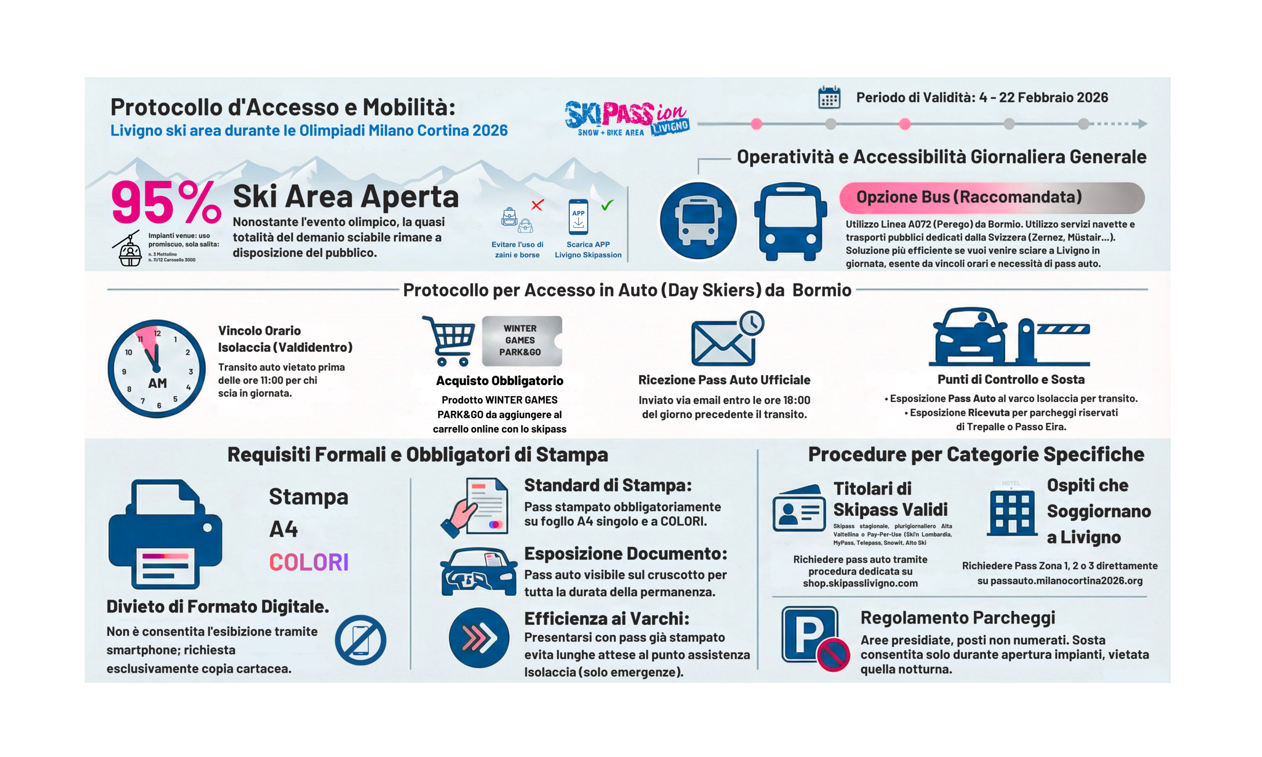 Livigno (SO) – In occasione dei Giochi Olimpici Invernali, l'Associazione Skipass Livigno conferma che il 95% della ski area rimarrà regolarmente aperto e fruibile per tutta la durata dell'evento. Sebbene la viabilità locale possa subire variazioni dovute alla portata internazionale della manifestazione, l'Associazione è impegnata a garantire la migliore operatività possibile per tutti gli appassionati di sport invernali. Di seguito, le informazioni principali: